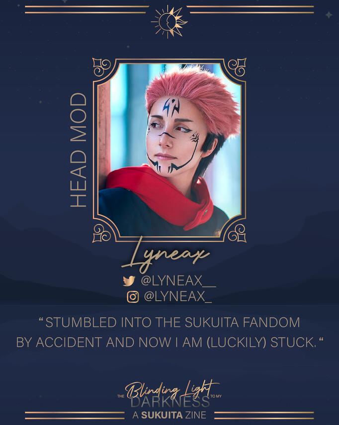 Pronouns: She/HerMod Activity: Head Mod, Art Mod and Graphic ModI am Lynea, 27 years old, graphic designer and catmum to my two adorable, fluffy menaces of cats !I've contributed to the fandom mostly by writing fanfictions and cosplaying as the King of Curses, but I also occassionaly draw. Got into SukuIta by accident while RPing with my cosplay partner Yuuji. We stumbled from jokes into smut. Oop–.The idea to start this zine has been in my head for a long time, and it is a dream come true to finally realize it.Looking forward to work together with all of you!-☼-