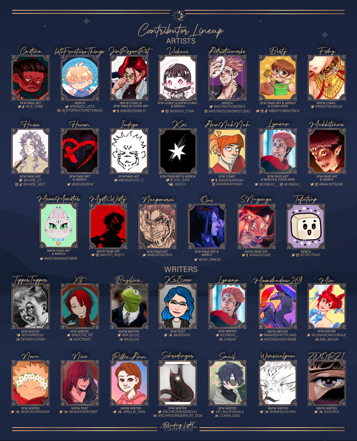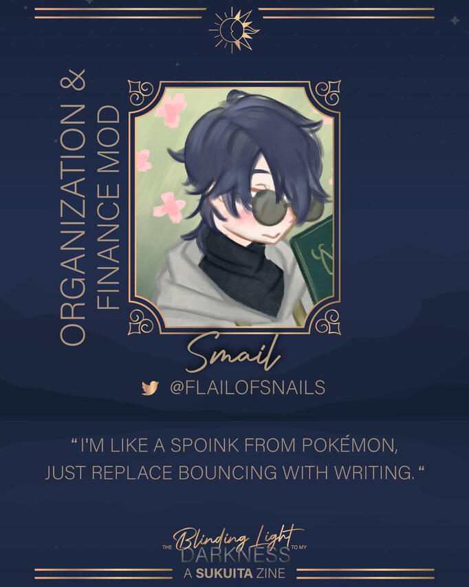 I write JJK fanfic under the username Cogni_Diss on AO3 with over 500k words under my belt. I have have a few ongoing zines for this fandom, with my first one wrapping up by the end of the year once ordering and shipping is done!I am very grateful for Lynea for putting this zine together, as SukuIta is my most beloved ship and I'll do anything for them! Schedules be damned, it's SukuIta time baby! ❤️Thank you for having me! I will do my best!-☼-