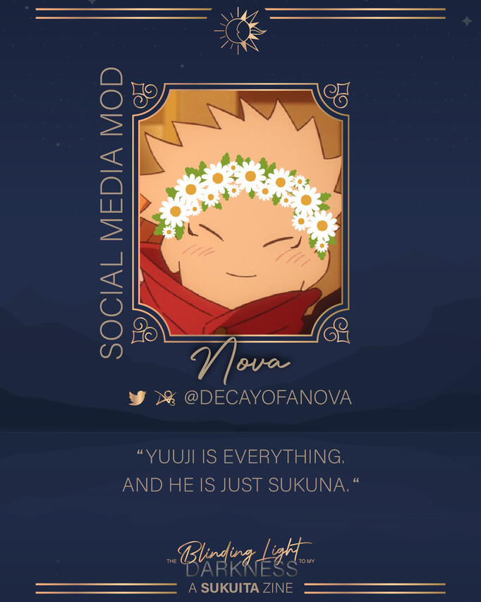 Mod Activity: SFW Writer ModYou can call me kappachyun! SukuIta is why I got into JKK in the first place, so it's full circle that my first ever JJK zine is SukuIta! Though I've only been writing JJK for a few months, I've been writing fic for about ten years. I'm currently in love with Yūji and Chōsō.-☼-